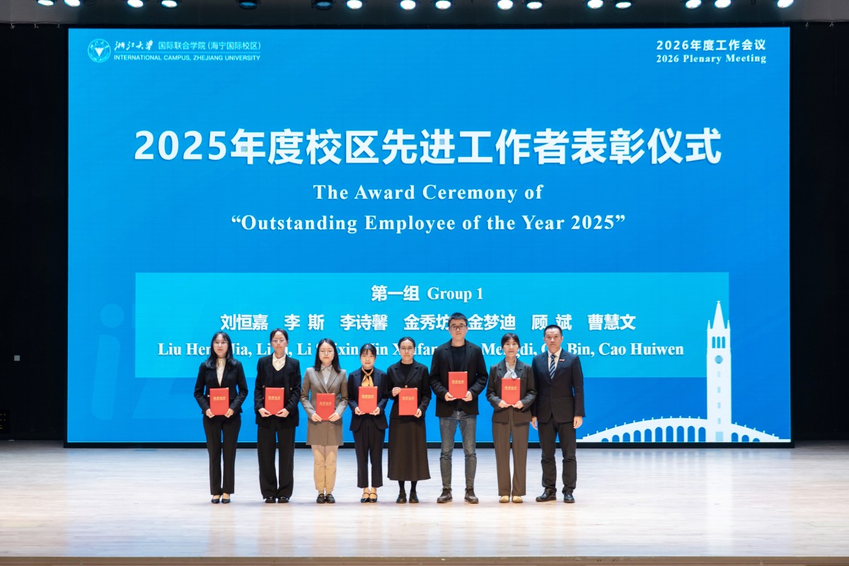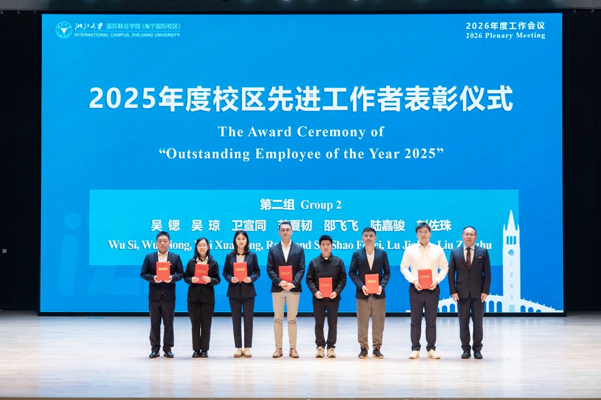 会上举行了2025年度先进工作者表彰仪式。李敏为浙江大学2025年度先进工作者王洲、2022-2025年浙江大学优秀工会工作者陈迪颁奖。巫英才,国际校区党委副书记、纪委书记瞿海东,副院长王宏伟分别为校区先进工作者颁奖。