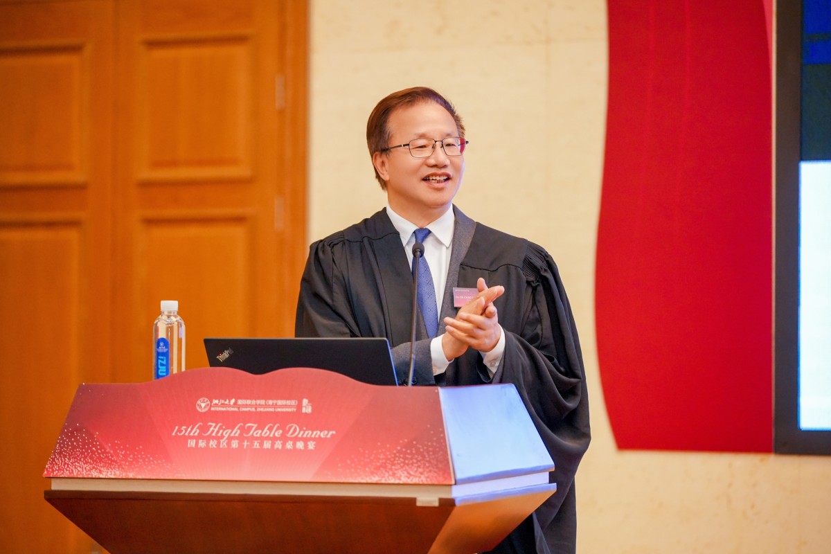 4月23日晚,浙江大学国际联合学院(海宁国际校区)第十五届高桌晚宴在国际校区多功能厅举行。本届高桌晚宴由观通书院主办,观通书院院长应义斌出席并主持晚宴,国际校区党委书记兼副院长李敏出席。担任本次高桌晚宴主讲嘉宾的是信达生物制药集团创始人、董事会主席兼首席执行官俞德超博士。