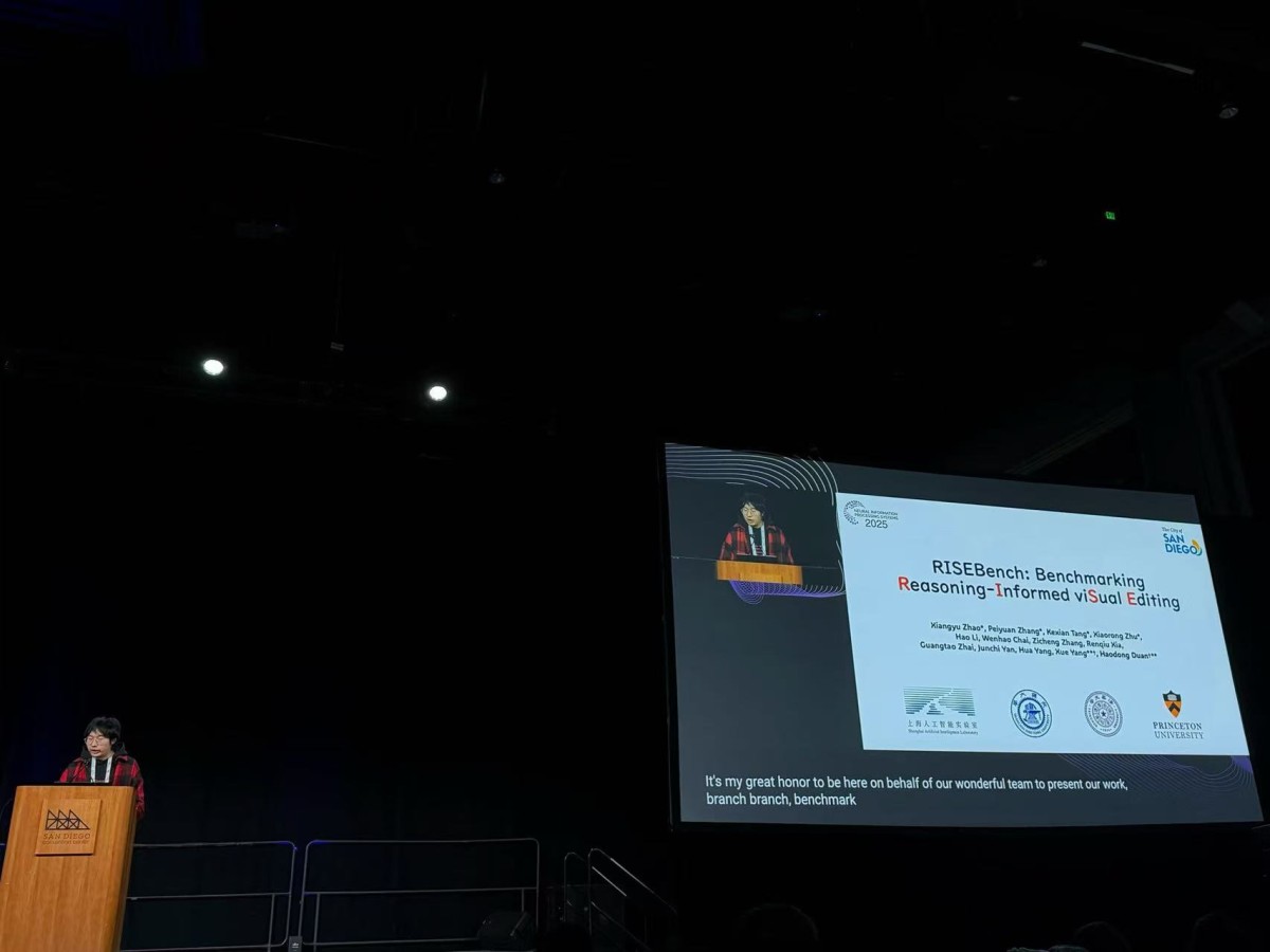 ▲柴文浩在 NeurIPS 2025 圣地亚哥会议现场发表演讲